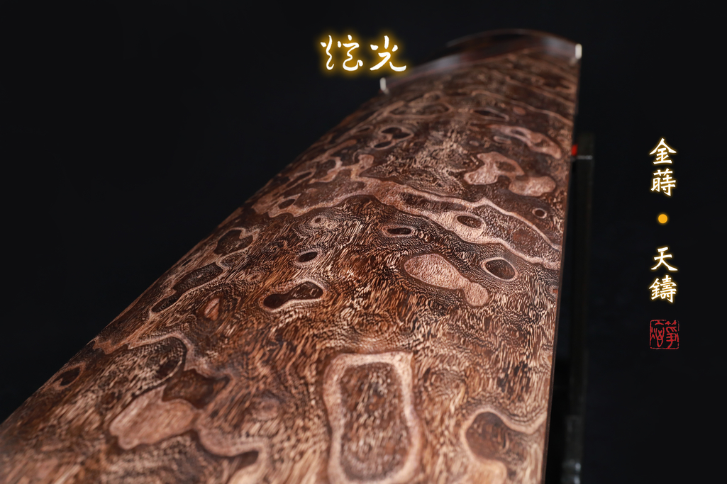 炫光製作團隊選用一段收藏經年、樹齡逾六十載、歷經數十年風乾、滿佈樹瘤的珍稀日本桐木琴體,配以印度小葉紫檀為飾面。