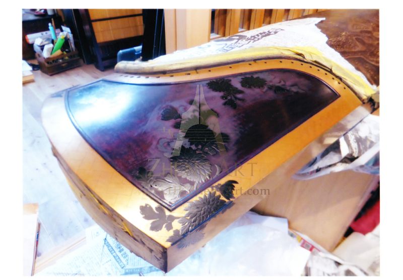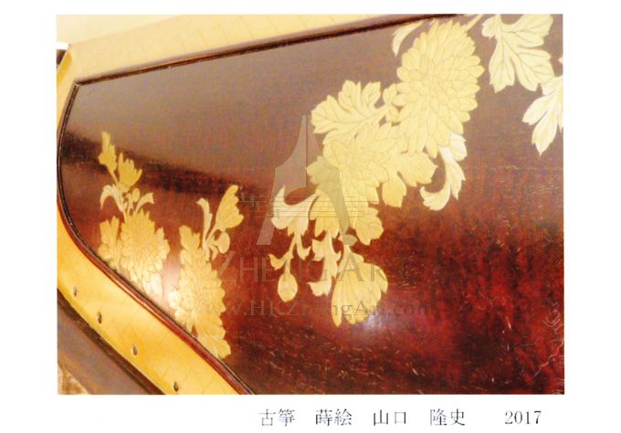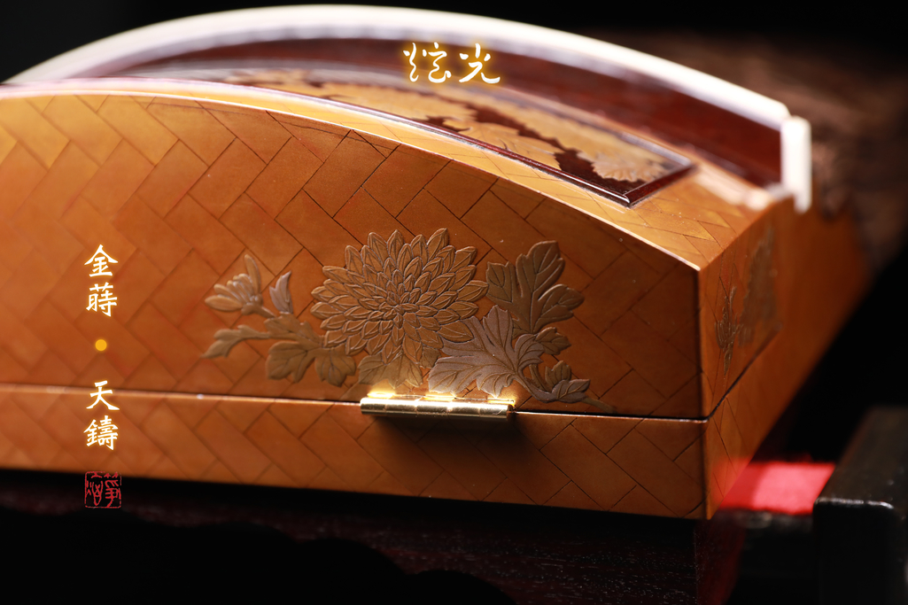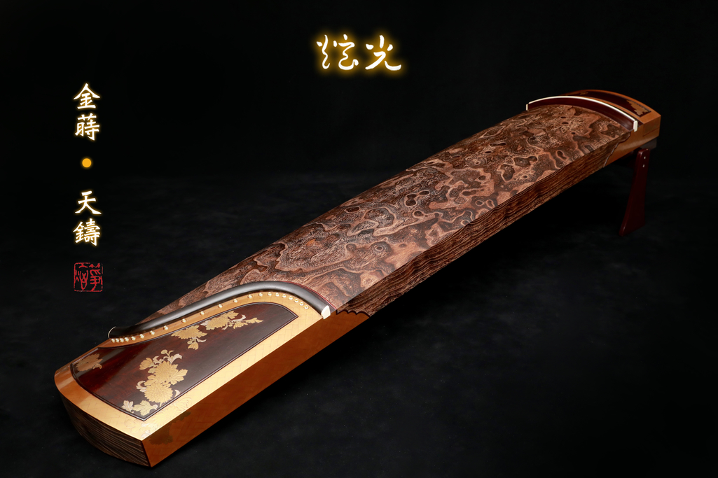 炫光的設計團隊與日本金蒔繪匠人山口隆史先生合作,於眾多日本蒔繪文物中尋找靈感。最終選擇以一個類似藤器圖案的格子設計的蒔繪首飾盒作基底,配以代表高雅,以高蒔繪技術製作、能從多角度鑒賞的立體菊花於藤格之上,並保留一部分原有小葉紫檀飾面作對比。設計圖總計八十七稿,前後歷時三個多月。敲定設計方案後,山口先生先為整個古箏所需製作蒔繪部分進行繁複的劃線和倒模工序。於製蒔繪進行之前,先以人手重新打磨小葉紫檀飾面達到近乎完美的滑溜狀態,再塗抹日本生漆於小葉紫檀飾面上作底漆。後以人手把黃金粉灑上漆面,形成類似藤器風格的格子圖案,每一個格子的製作前後耗時十小時。由於生漆風乾需時不一,所以每個格子顏色都是獨一無二,仿如一件古代歷史文物一樣。在已完成的金蒔繪格子後,山口先生再次以人手塗抹生漆,後以人手把金粉灑於其上製作立體菊花圖案。最後以人手打磨蒔繪,直到極薄如鏡面的反光效果。由於日本生漆需要時間才能逐步乾透,乾透期間表面硬度會變化,外觀因而逐步變得更閃亮,黃金效果會更突出。整個過程約需時一年。