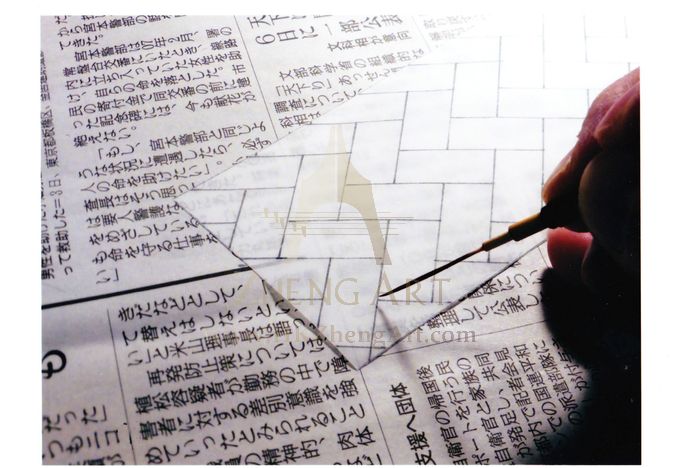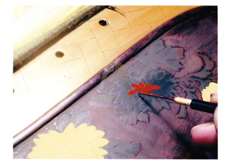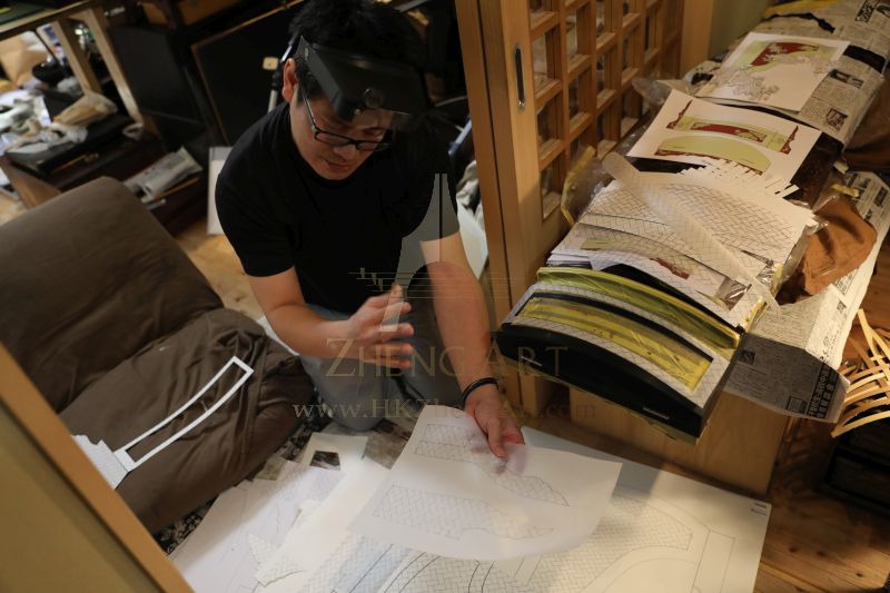 後以人手把純金粉灑上漆面,形成類似藤器風格的格子圖案。每一個格子的製作前後耗時十小時。
