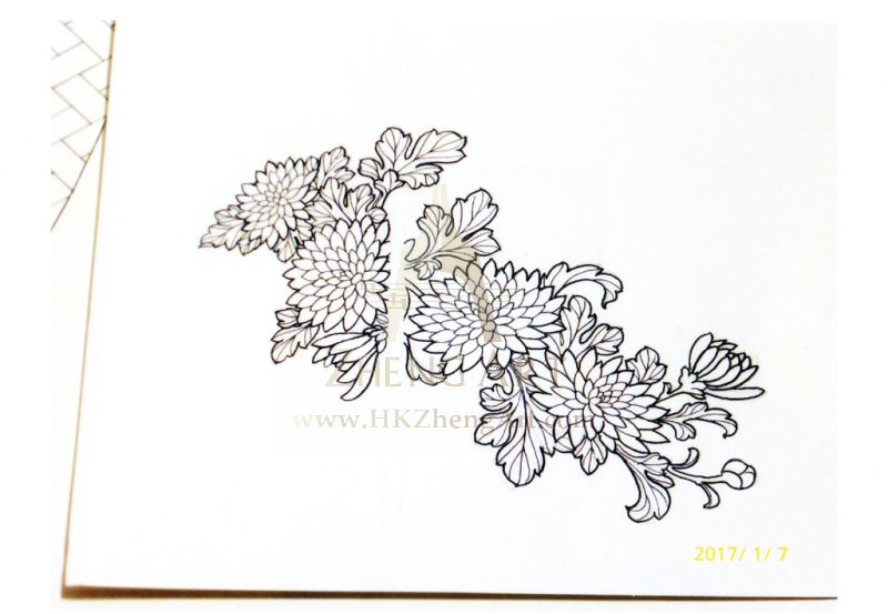 配以代表高雅,以高蒔繪技術製作、能從多角度鑒賞的立體菊花於藤格之上,並保留一部分原有小葉紫檀飾面作對比。設計圖總計八十七稿,前後歷時三個多月。