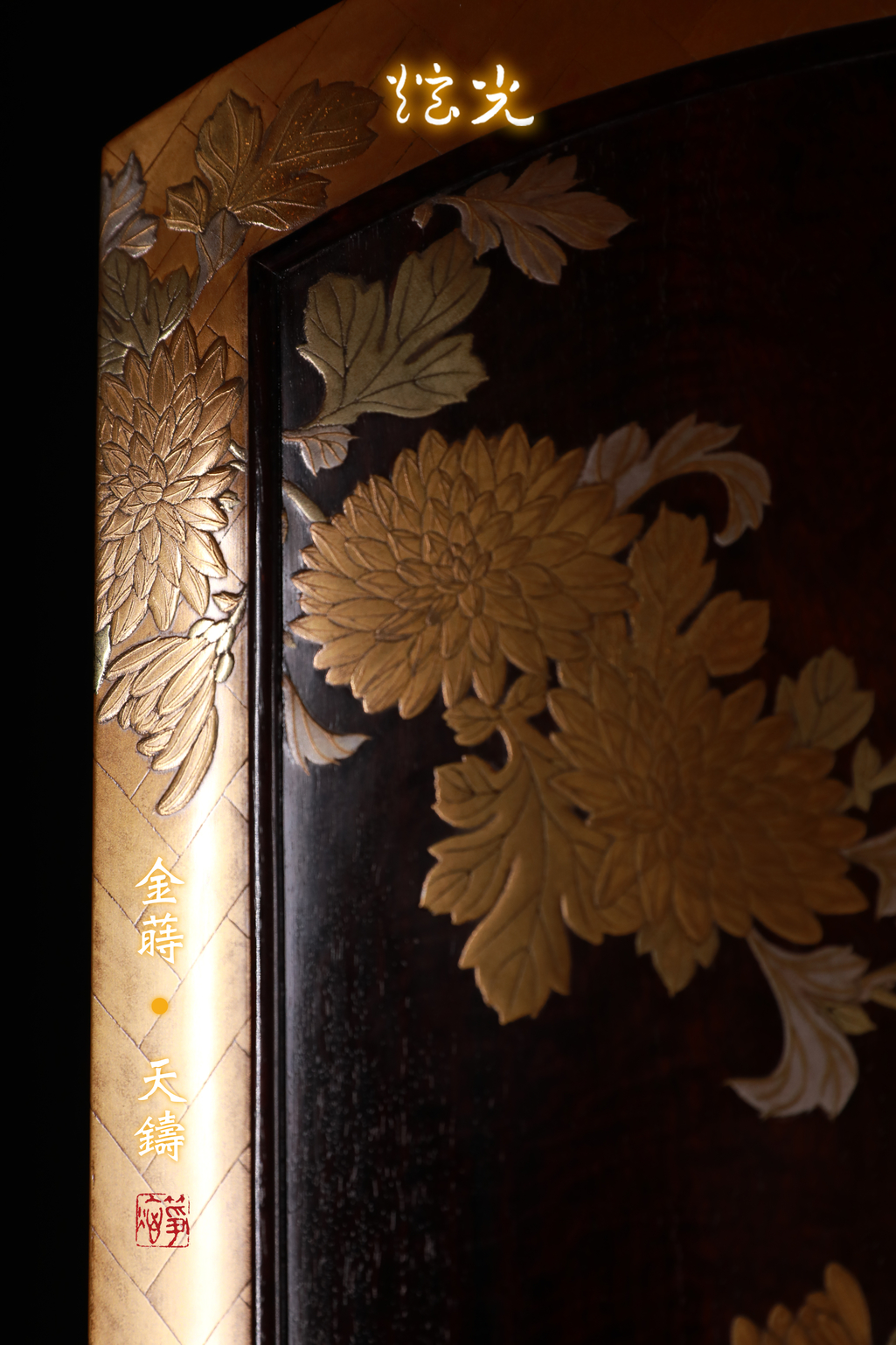 山口先生在已完成的金蒔繪格子上,再次以人手塗抹生漆,後以人手把金粉灑於其上製作立體菊花圖案。