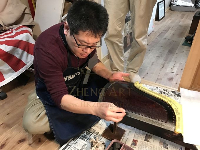 山口先生於製蒔繪進行之前,先以人手重新打磨小葉紫檀飾面達到近乎完美的滑溜狀態,再塗抹日本生漆於小葉紫檀飾面上作底漆。