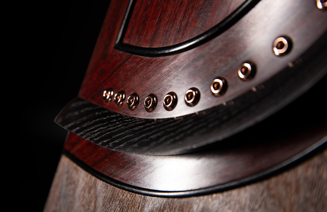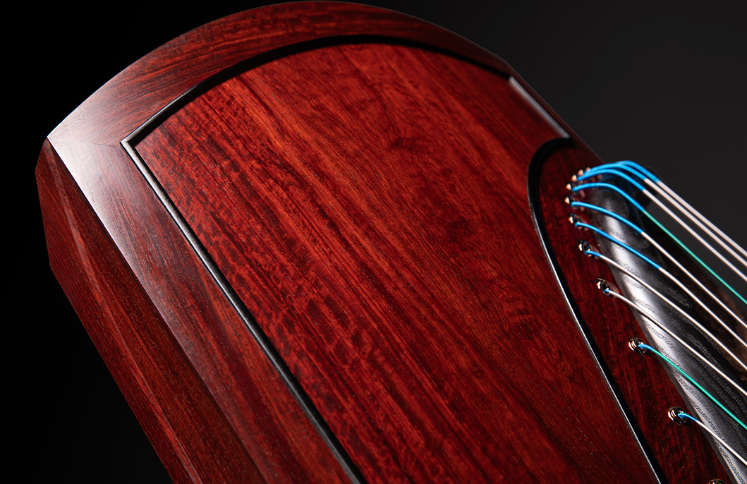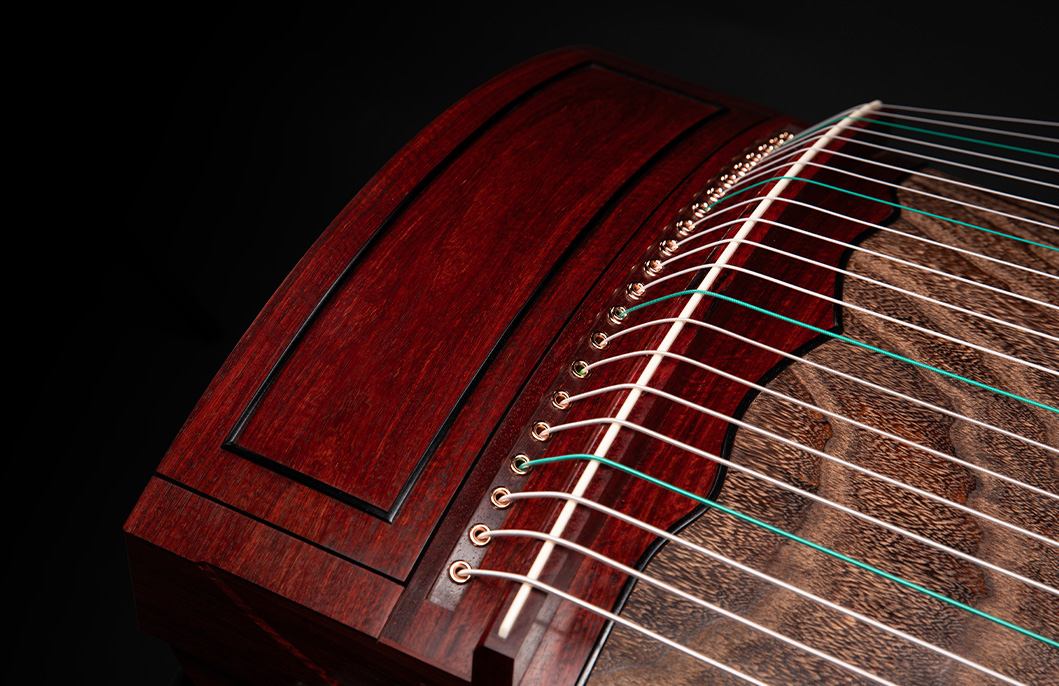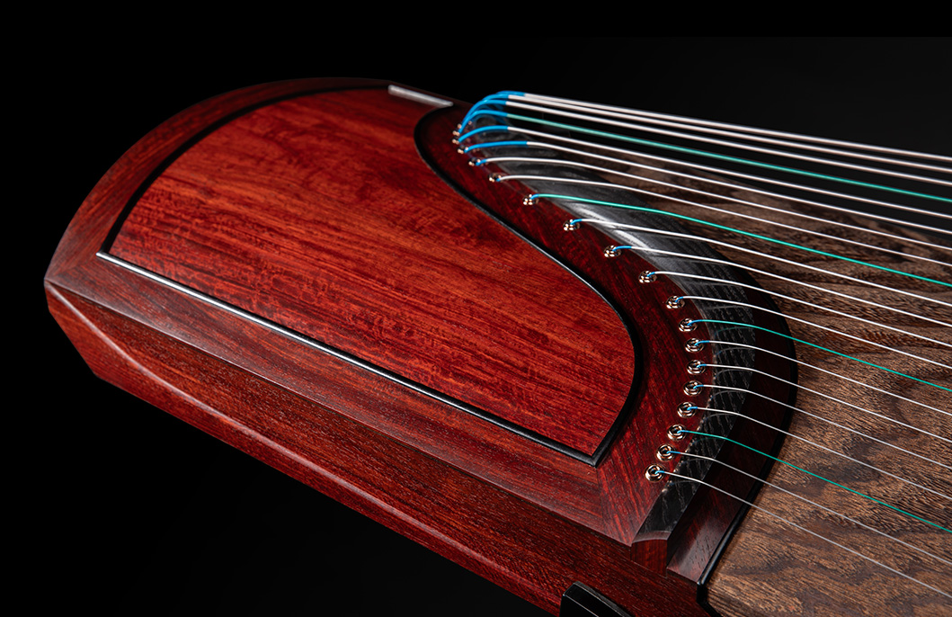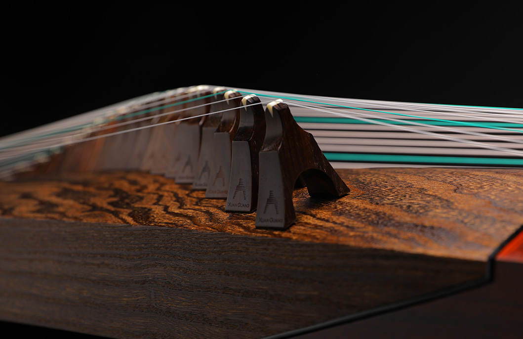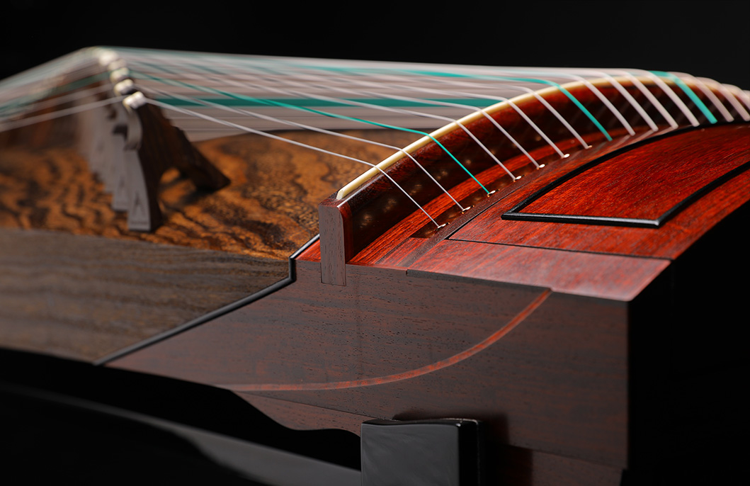 岳山選用整條的印度小葉紫檀,經工匠反覆調整弧度入榫裝嵌,將箏音的傳導昇華。