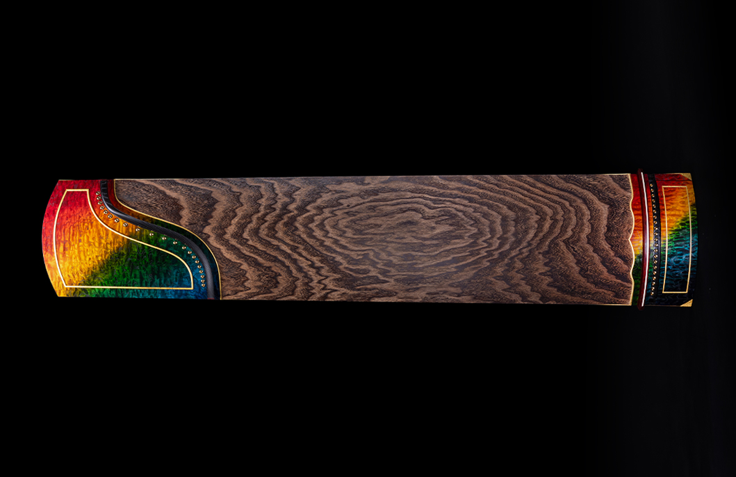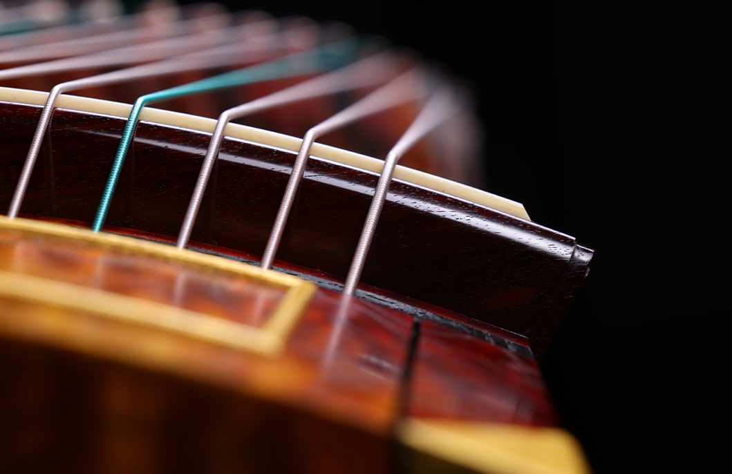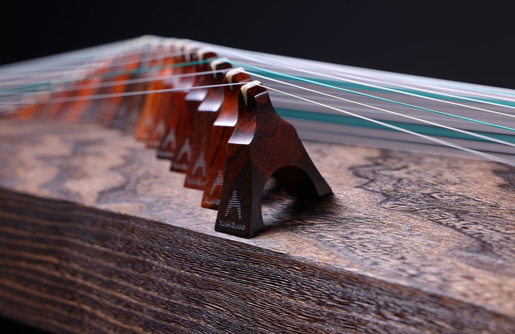 岳山選用整條的印度小葉紫檀,經工匠反覆調整弧度入榫裝嵌,獨特的傾角設計有效的提高了聲音的傳導和共鳴,使得古箏音色得到進一步的昇華。
