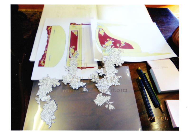 配以代表高雅,以高蒔繪技術製作、能從多角度鑒賞的立體菊花於藤格之上,並保留一部分原有小葉紫檀飾面作對比。設計圖總計八十七稿,前後歷時三個多月。