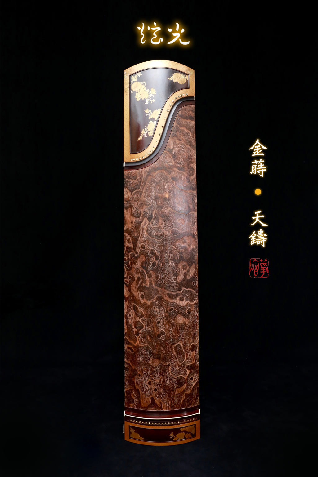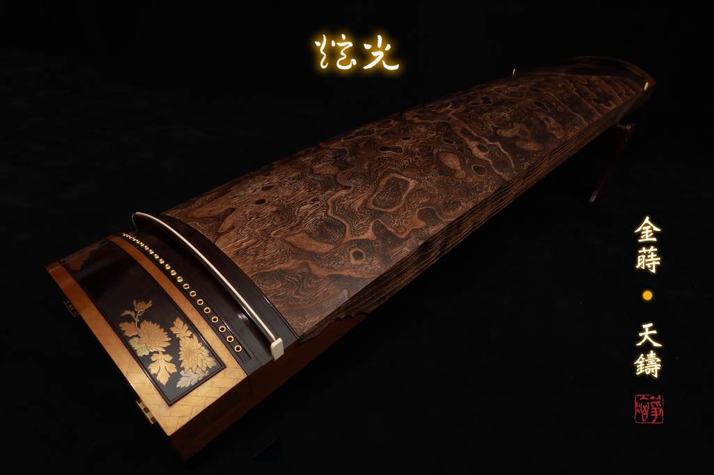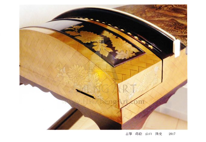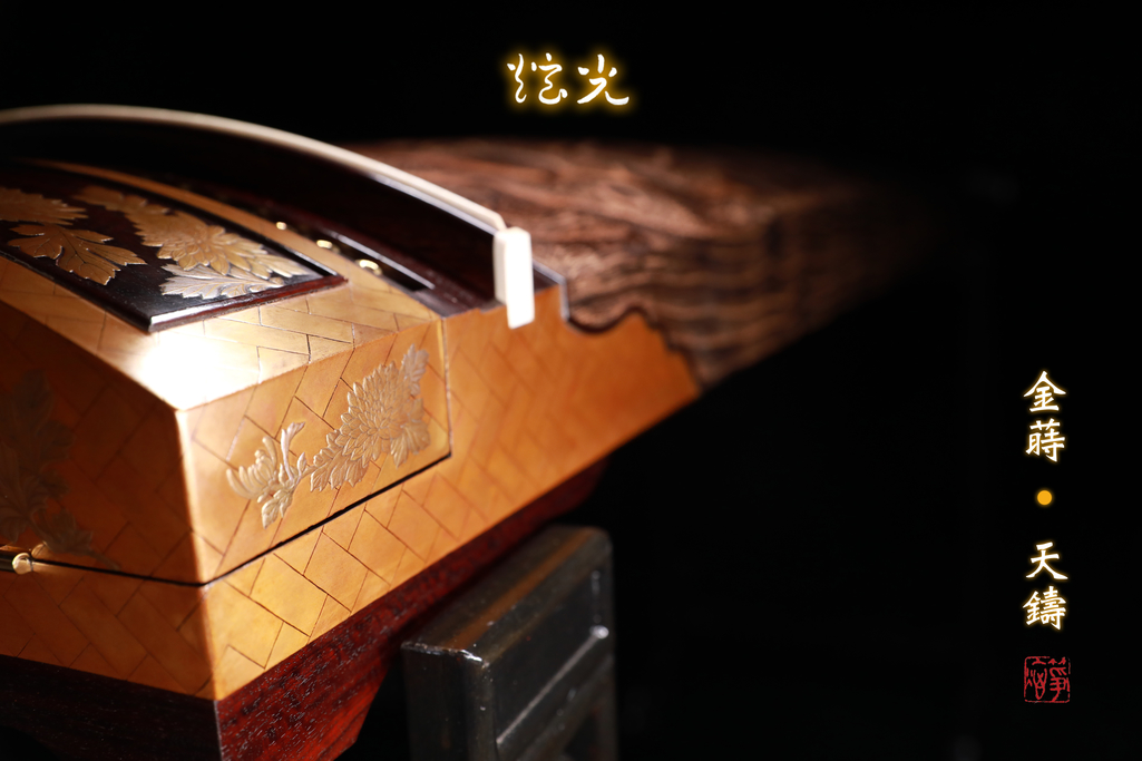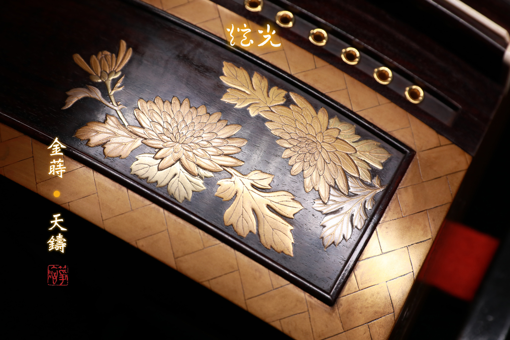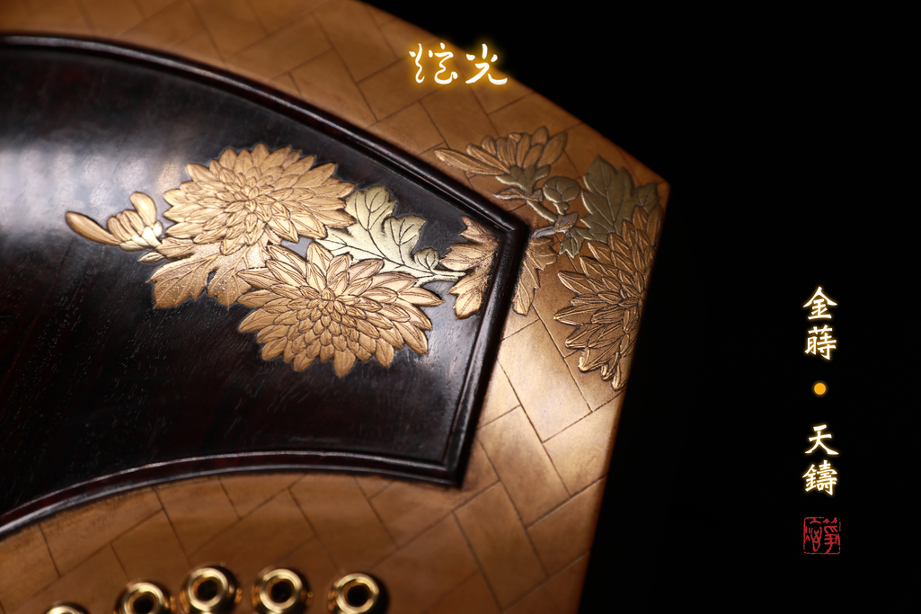 炫光的設計團隊與日本金蒔繪匠人山口隆史先生合作,於眾多日本蒔繪文物中尋找靈感。最終選擇以一個類似藤器圖案的格子設計的蒔繪首飾盒作基底,配以代表高雅,以高蒔繪技術製作、能從多角度鑒賞的立體菊花於藤格之上,並保留一部分原有小葉紫檀飾面作對比。設計圖總計八十七稿,前後歷時三個多月。敲定設計方案後,山口先生先為整個古箏所需製作蒔繪部分進行繁複的劃線和倒模工序。於製蒔繪進行之前,先以人手重新打磨小葉紫檀飾面達到近乎完美的滑溜狀態,再塗抹日本生漆於小葉紫檀飾面上作底漆。後以人手把黃金粉灑上漆面,形成類似藤器風格的格子圖案,每一個格子的製作前後耗時十小時。由於生漆風乾需時不一,所以每個格子顏色都是獨一無二,仿如一件古代歷史文物一樣。在已完成的金蒔繪格子後,山口先生再次以人手塗抹生漆,後以人手把金粉灑於其上製作立體菊花圖案。最後以人手打磨蒔繪,直到極薄如鏡面的反光效果。由於日本生漆需要時間才能逐步乾透,乾透期間表面硬度會變化,外觀因而逐步變得更閃亮,黃金效果會更突出。整個過程約需時一年。