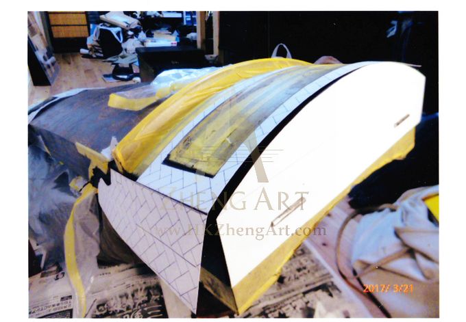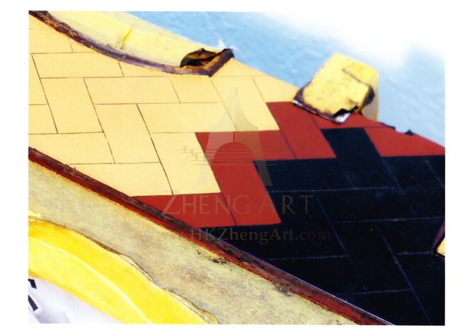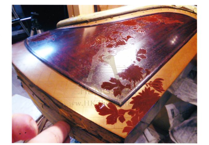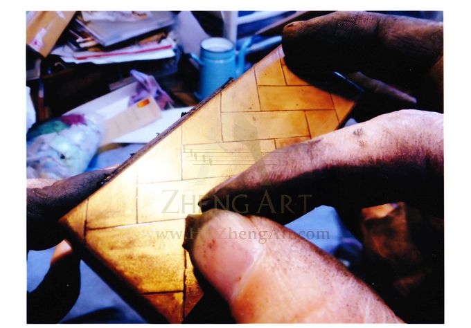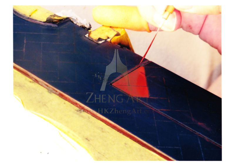 後以人手把純金粉灑上漆面,形成類似藤器風格的格子圖案。每一個格子的製作前後耗時十小時。